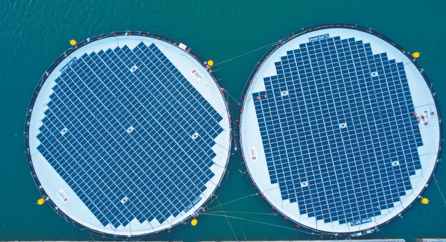 該項目位于山東省煙臺市海陽市南側(cè)海域,離岸30千米,水深30米。本次建設(shè)的500千瓦漂浮式海上光伏由兩個環(huán)形浮體單元組成,在直徑53米,面積相當(dāng)于4個標(biāo)準(zhǔn)籃球場的浮體單元上,共安裝了770塊光伏組件。該項目驗證了浮體、錨固、發(fā)電組件抗風(fēng)浪能力以及風(fēng)光同場并網(wǎng)的技術(shù)可行性。
